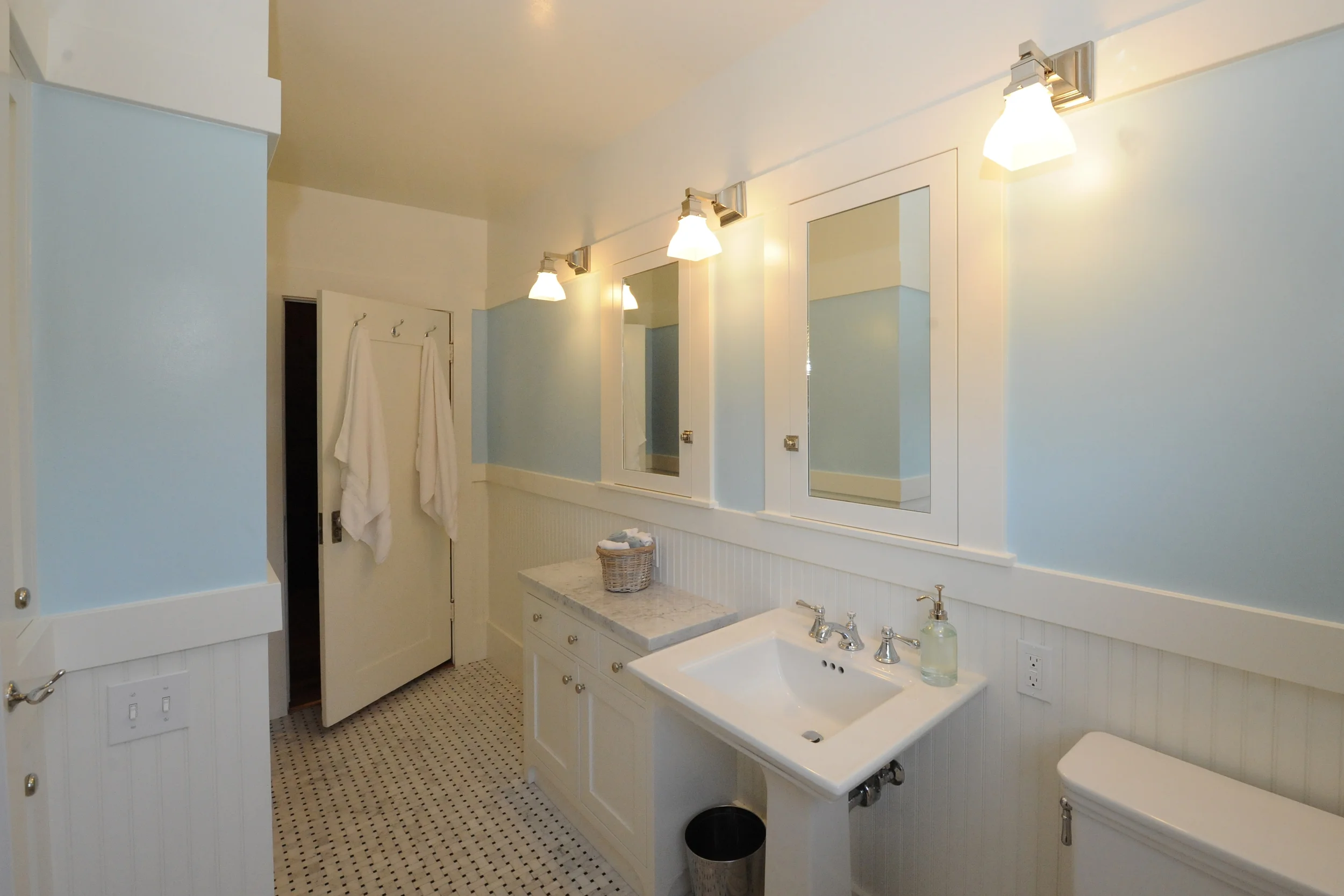 A neutral palette that blends modern aesthetic with traditional style gives the bathroom a polished look.